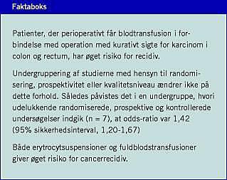 I Cochrane-review' et [4] konkluderes det således, at der er en sammenhæng mellem POBT og en øget risiko for cancerrecidiv hos patienter, som opereres med kurativt sigte for karcinom i colon og rectum. Dette gør sig gældende for både colon- og rectumcancer, for tidlige og avancerede tumorer, og det sker formentlig afhængigt af antal blodtransfusioner, uanset tidspunktet eller typen (fuldblod, SAG-M-blod etc.). På baggrund af Cochrane-review' et [4] samt et nyt dansk arbejde [8] anbefales en restriktiv indikation for blodtransfusion til patienter, som opereres for karcinom i colon og rectum.