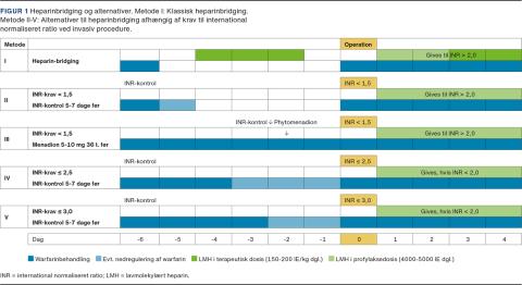 Da ingen af de foreliggende studier af H-B har vist signifikant reduktion af forekomsten af TE i forbindelse med invasive procedurer, men derimod ofte øget incidens af blødningskomplikationer, er der grund til at overveje alternativer til H-B, herunder præoperative tiltag som forkortet præoperativ pause med VKA, anvendelse af vitamin K præoperativt og ingen eller kun delvis nedregulering af VKA-behandlingen. Postoperativt gives LMH i profylaksedosis til INR er i terapeutisk niveau (Figur 1).
