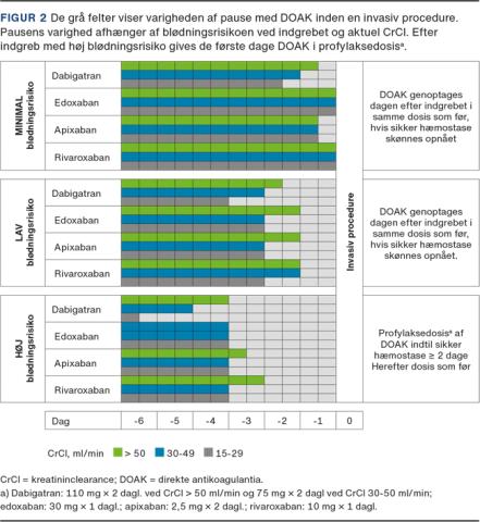 Ved planlægning af præoperativ pause med DOAK skal der dels tages hensyn til nyrefunktionens påvirkning af præparaternes plasmahalveringstid, dels blødningsrisikoen ved den planlagte procedure (Tabel 1) og dels mulige interaktioner [12, 16-18]. Ved procedurer med minimal blødningsrisiko kan indgrebet foretages efter pause i 1-2 halveringstider. Ved lav blødningsrisiko kræves pause i 2-3 halveringstider, og ved høj blødningsrisiko kræves pause i fem halveringstider. Ved nedsat nyrefunktion kræves længere pausering op til indgrebet (Figur 2).