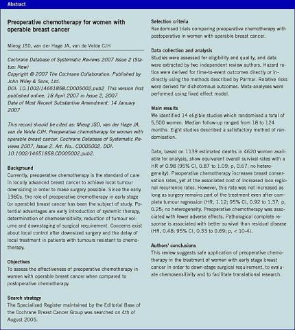 <li>Mie og JSD, van der Hage JA, van der Velde CJH. Preoperative chemotherapy for women with operable breast cancer. Cochrane Database of Systematic Reviews 2007, Issue 2. Art No.:CD005002. DOI: 10.1002/14651858.</li>