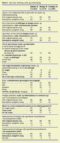 Der blev udsendt spørgeskemaer til 1.842 læger. I alt 546 skemaer (30%) blev returneret, men heraf var der 23 besvarelser fra læger, som ikke var ansat på enten kirurgiske eller anæstesiologiske afdelinger (udeladt fra opgørelsen). Således er resultaterne baseret på besvarelser fra 309 ud af 875 læger (35%) ansat på de anæstesiologiske afdelinger og på besvarelser fra 214 ud af 944 læger (23%) ansat på de kirurgiske afdelinger. Undersøgelsens resultater er vist i Tabel 1 , Tabel 2 , Tabel 3 og Tabel 4 . Besvarelserne fordelte sig ligeligt mellem ansatte på universitetshospitaler og centralsygehuse (Tabel 1). Det bemærkes, at 75% af besvarelserne kom fra seniore læger (1. reservelæger/afdelingslæger/overlæger). Af de samlede besvarelser angav 79%, at der var for lidt eller slet ingen undervisning om emnet på deres afdeling (Tabel 2). Endvidere fandt vi, at 76% mente, at man før ordination af infusionsvæsker burde beregne væske- og elektrolytbehovet, mens kun 42% faktisk efterlevede dette. I Tabel 3 indgår data for bl.a. instrukser og ansvarsplacering. Heraf fremgår det, at der kun forefindes instrukser for væske- og elektrolytbehandling på afdelingerne hos 45% af de adspurgte, og samtidig angiver 23%, at væske- og elektrolytbehandling er et lavt prioriteret område (Tabel 3). Selv om 99% af de adspurgte mente, at de selv havde ansvaret for at opnå den nødv endige viden på området, angav 64%, at en stor del af ansvaret påhvilede afdelingens ledende overlæge. Den faktuelle viden på området er belyst i Tabel 4, hvor andelen af rigtige svar varierede mellem 5% og 63% inden for de forskellige kategorier.