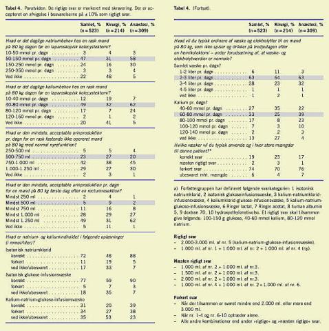 Diskussion: Da perioperativ væskebehandling har betydning for udvikling af komplikationer efter kirurgiske indgreb, er det uhensigtsmæssigt, at den faktuelle viden er så lav både hos kirurger og anæstesiologer. Man må derfor opfordre til en øget national indsats såvel præ- som postgraduat initieret af fakulteterne og de videnskabelige selskaber. Der bør på hver afdeling foreligge klare retningslinjer for denne del af patientbehandlingen, og det må pointeres, at den enkelte læge er medansvarlig for tilegnelse af tilstrækkelig viden på området for at kunne varetage væske- og elektrolytbehandling af høj kvalitet.