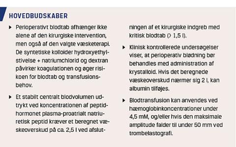 nyrefunktionen og blodets koagulation, men en metaanalyse har vist, at det senest udviklede produkt, HES 130/0.4, Voluven, også i højere grad nedsætter blodets koagulationsevne og øger blodtabet peroperativt end krystalloid [14]. Desuden kan man bedre vedligeholde plasmavolumenet med albumin end med HES + natriumchlorid [15]. I en nyere metaanalyse, hvis endepunkter var mortalitet og nyrepåvirkning, kunne der dog ikke anføres generelle restriktioner for anvendelse af kolloider [16]. Det er bekymrende, at et væskeoverskud på mere end 2 l synes at være relateret til postoperative komplikationer [13]. Det er derfor ikke hensigtsmæssigt at basere væsketerapi udelukkende på administration af krystalloid ved kirurgiske indgreb med kritisk blodtab. Infusion af et kolloid er nødvendig for ikke at udsætte patienten for postoperative komplikationer i relation til væskeoverskud. Ved valg af kolloid synes administration af albumin at være »sikker«, men hvis HES + natriumchlorid foretrækkes af f.eks. økonomiske grunde, bør administrationen være mindre end 1 l [18]. Blodtransfusion kan anvendes ved hæmoglobinkoncentration under 4,5 mM, og/eller hvis den maksimale amplitude ved trombelastografi falder 20%, dvs. til ca. 50 mm.