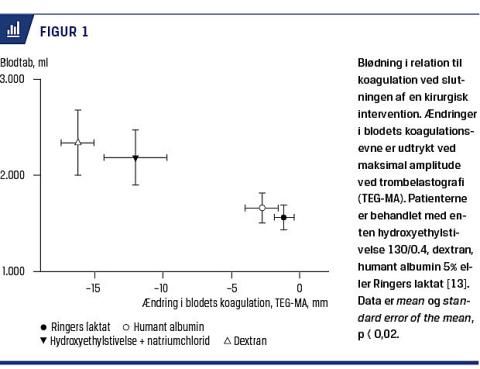 Perioperativ koagulationskompetence har betydning for transfusionsbehovet og synes at være prædiktor for såvel morbiditet som mortalitet [5, 7]. De syntetiske kolloider gelatine, dextran og hydroxyethylstivelse (HES) inducerer koagulopati, idet trombocytternes funktion og fibrinens polymerisationsgrad nedsættes in vitro [17]. Disse virkninger ses allerede efter infusion af 1.000 ml HES + natriumchlorid, og ved administration af dextran ses virkningen efter infusion af et mindre volumen [18].
