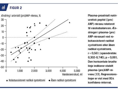 p = 0,002 og med væskebalancen r = 0,561 (spændvidde:0,302-0,740), p = 0,001 [13] (Figur 2). Disse resultater indikerer, at et stabilt plasma (pro)ANP kræver et skematisk beregnet væskeoverskud på ca. 2,5 l ved afslutning af en kirurgisk intervention [29, 30].