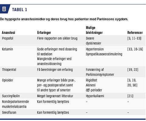 Propofol har ikke farmakodynamisk eller kinetisk interaktion med antiparkinsonmedicin. Det er beskrevet, at propofol kan fremkalde dyskinesier hos alle uanset komorbidtet. Deogaonkar et al har beskrevet udtalte og vedvarende dyskinesier hos en patient med PS under propofolsedation [11]. Patienten var uden medicin for PS i mange timer før sedationen. I andre studier har man haft gode erfaringer med propofol som middel til anæstesi og sedation [12-15]. Propofol er formentlig det anæstetikum, man har størst erfaring med til anæstesi af patienter med PS, og det anses som sikkert at anvende [13]. Ketamin har været relativt kontraindiceret til patienter med PS grundet en teoretisk bekymring for overstimulering af det sympatiske nervesystem. Denne bekymring understøttes ikke i nogen kasuistikker eller studier. Lettieri et al og Hetherington & Rosenblatt har fundet god sedativ effekt af ketamin [16, 17]. Wright et al brugte ketamin præoperativt hos en patient med tidligere vanskelig luftvej [18].