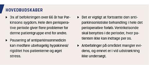 Parkinson’s disease (PD) is a neurogenerative disease, which causes motoric disorders, and the risk of developing PD increases with age. There is an increasing number of persons above 60 years undergoing anaesthesia, and PD is becoming a common comorbidity. PD symptoms, delayed medicine administration or medical side effects can complicate anaesthesia. The importance of correct administration of PD medication administration must be emphasized to avoid complications. Optimized perioperative care can potentially prevent complicated and prolonged admission periods.