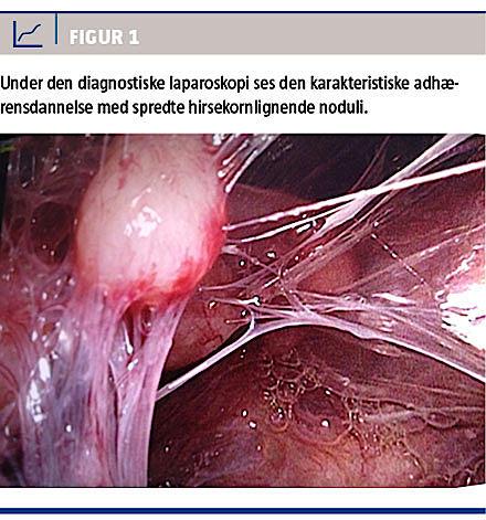Der blev foretaget en CT af abdomen, og man påbegyndte bredspektret sepsisbehandling. Den vagthavende radiolog fandt de abdominale fund på CT’en uspecifikke, dog var der mistanke om multiple intraabdominale abscesser. Endvidere var der let tyndtarmspåvirkning og sparsomme mængder ascites. Da patienten umiddelbart efter CT’en blev vurderet peritonealt, blev der udført en diagnostisk laparoskopi. Her fandtes utallige, nodulære, »flæskede« plaques overalt på peritoneum samt spindelvævslignende »tråde« i hele abdominalkaviteten, og de dækkede tillige tarmgebetet (Figur 1). Peroperativt blev det vurderet, at de radiologisk mistænkte intraabdominale abscesser udgjordes af de ovennævnte plaques, og der fandtes ikke holdepunkt for anden tilgrundliggende kirurgisk interventionskrævende lidelse. På mistanke om Ptb og differentialdiagnostisk peritoneal karcinose blev der under den primære laparoskopi udtaget biopsier fra de nodulære plaques og peritoneum til akut mikroskopi, polymerasekædereaktions (PCR)-analyse og histopatologisk undersøgelse.