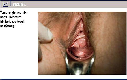 Den kliniske undersøgelse viste flere spredte tumorer i vaginas for- og bagvæg samt i vaginaltoppen (Figur 1). Den største tumor målte ca. 2 × 2 cm. Alle var uømme, velafgrænsede og frit mobile. Ultrasonisk fremstod de som fibromer, men pga. den usædvanlige lokalisation blev der taget biopsier.