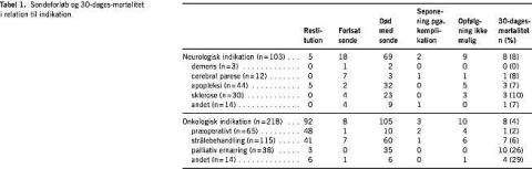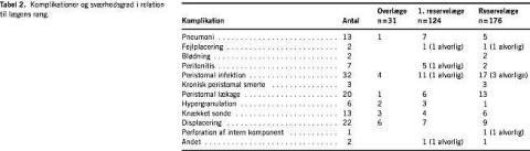 Resultater: I alt 335 sondeforløb blev registreret hos 327 patienter. Medianalderen var 65 år (spændvidde: 3 måneder-94 år). Indikationen var onkologisk i 65,1% af forløbene, neurologisk i 30,7% og andet i 4,2%. Mindst en komplikation blev registreret i 103 af forløbene (30,7%) og alvorlig komplikation i ni (2,7%). Peritonitis blev registreret i 2,1% af forløbene, fejlplacering i 0,6%, pneumoni i 3,9%, blødning i 0,6%, peristomal infektion i 9,6%, kroniske peristomale smerter i 0,6%, peristomal lækage i 6%, hypergranulation i 1,8%, sondefraktur i 3,9%, displacering i 6,6% og andet i 0,9%. En patient døde i tilslutning til fjernelse af PEG-sonden. Der fandtes ingen forskel i hyppigheden af komplikationer i relation til operatør. Dog sås alvorlige komplikationer kun i reservelægegruppen. Median followup- tid var 123 dage (spændvidde: 0-3.624 dage). I 30 forløb (9%) døde patienterne inden for 30 dage. Hos 31% blev sonden fjernet efter restitution, 54% døde med en fungerende sonde, 8% af patienterne var i live med en fungerende sonde, hos 1% blev sonden fjernet på grund af komplikation, og hos 6% var opfølgning ikke mulig.