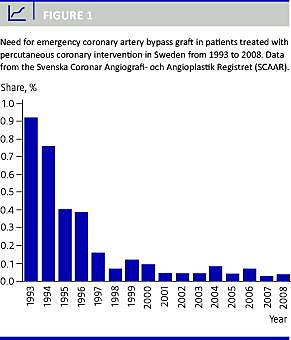Da perkutan koronarintervention (PCI) blev introduceret, var der ofte behov for akut hjertekirurgi på grund af PCI-relaterede komplikationer. Siden er metoden blevet udviklet, og de seneste ti år har den procedurerelaterede dødelighed og behovet for akut hjertekirurgisk intervention på grund af PCI-relaterede komplikationer været meget lave (< 1) (Figur 1 ). Ventetiden på PCI-behandling har i mange år været lang for patienter i Region Sjælland. Under henvisning til manglende hjertekirurgisk tilstedeværelse, tilstrækkelig kapacitet og høj kvalitet på de eksisterende PCI-centre har Sundhedsstyrelsen tidligere afvist etablering af lokale PCI-centre. I 2008 fik Roskilde Sygehus tilladelse til PCI uden hjertekirurgisk tilstedeværelse. Aktiviteten og kvaliteten af behandlingen de første seks måneder beskrives her.