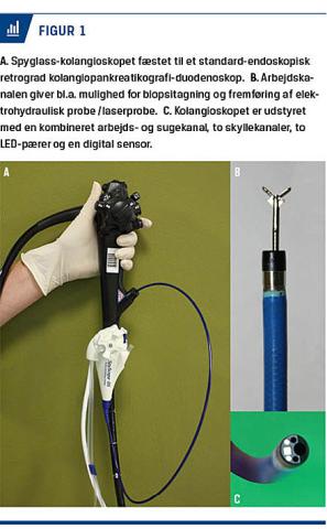 2) single-operator-mor-barn-kolangioskopi og 3) direkte kolangioskopi med tynde endoskoper. I dag er single-operator-kolangioskopi langt det mest udbredte system i Skandinavien, hvor især Spyglass-kolangioskopet udviklet af Boston Scientific Corp i 2006 har vundet indpas [5, 13]. Ved Spyglass-systemet nedføres kolangioskopet gennem duodenoskopets arbejdskanal og fastgøres herefter på duodenoskopet, således at systemet kan styres af en enkelt endoskopør (Figur 1). Spyglass-kolangioskopet kan bevæges i begge planer som et almindeligt endoskop, og en arbejdskanal giver mulighed for fremføring af udstyr til stenknusning og biopsitagning [11, 14]. I 2015 blev systemet forbedret med implementering af digital billeddannelse og en
