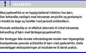 Akut pyelonefritis hos børn behandles vanligvis med intravenøs ampicillin og gentamycin i mindst tre dage og herefter perorale antibiotika. I denne artikel gennemgås på baggrund af en systematisk litteratursøgning evidensen for at behandle pyelonefritis peroralt. Dette synes at være et effektivt alternativ. Der foreligger dog ikke danske mikrobiologiske studier over anvendelige præparater til dette formål.
