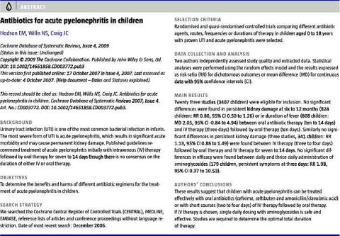 <li>Hodson EM, Willis NS, Craig JC. Antibiotics for acute pyelonephritis in children.Cochrane Database Syst Rev 2007;(4):CD003772.</li>