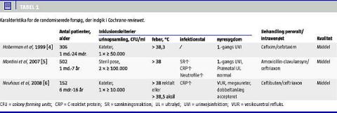 De tre randomiserede forsøg [4-6] inddrager 960 børn i alderen fra en måned til 16 år. Alle børn havde temperatur over 38 grader celcius og positiv urindyrkning (colony forming units /ml ≥ 104 -105 ) opsamlet ved katerisering [4, 6] eller steril pose [5]. I to af forsøgene havde børnene ikke tidligere kendt urinvejssygdom [4, 5]. I to af forsøgene [4, 6] krævede man endvidere forhøjelse af infektionsparametre for at stille diagnosen pyelonefritis (se Tabel 1 ). Børnene blev behandlet i 10-14 dage peroralt (cefixim eller amoxicillin/clavulansyre) eller intravenøst med cefotaxim [4] eller ceftriaxon [5, 6] i tre dage eller til de blev afebrile, hvorefter der blev behandlet peroralt.
