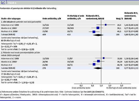 Forholdet af parenkymale defekter konstateret ved dimercaptosuccinic acid (DMSA)-skintigrafi efter 6-12 måneder viste ingen signifikante forskelle mellem de to grupper (Figur 1 ), hverken af det totale antal af børn med pyelonefritis (parenkymdefekt: 63/409 med orale antibiotika versus 80/415 med initial intravenøs behandling, relativ risiko (RR) 0,80; 95% konfidensinterval (KI) 0,50 til 1,26) eller af den gruppe, der havde defekter på den initiale DMSA-skintigrafi (62/276 med orale antibiotika versus 77/259 med initial intravenøs behandling, RR 0,77; 95% KI 0,53 til 1,11). Der var heller ikke forskel på størrelsen af de persisterende renale parenkymdefekter vist ved DMSA-skintigrafi (weighted mean difference (WMD) -0,70; 95% KI -1,74 til 0,34). I en posthoc-subgruppeanalyse med få børn fandt man, at børn med dilaterende vesikouretral refluks (VUR) af grad III-V havde større sandsynlighed for parenkymdefekt på DMSA-skintigrafi efter seks måneder, hvis de havde fået oral antibiotika sammenlignet med intravenøs + oral antibiotika (8/24 med oral antibiotika versus 1/22, RR 7,33; 95% KI 1,00 til 54,01).