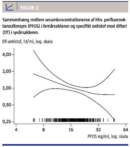 PFOS-koncentrationen i mødrenes serum viste negativ sammenhæng med antistofkoncentrationen hos børnene ved femårsalderen, idet en fordobling af koncentrationen af PFC var associeret med en reduktion i DT-antistof på knap 40%, altså omkring dobbelt så kraftig en effekt som for PCB [11]. PFC-koncen-trationen i børnenes serum ved femårsalderen viste de stærkeste negative sammenhænge med antistofkoncentrationerne ved syvårsalderen (Figur 2). Ved en samlet analyse af data sås en fordobling af PFC-koncentrationen i børnenes serum ved femårsalderen at medføre en reduktion på knap 50% i antistofkoncentrationen. Endvidere var en fordobling i PFOS- og PFOA-koncentrationen ved femårsalderen forbundet med odds ratios på 2,4-4,2 for at komme under et beskyttende antistofindhold på 0,1 IE/ml ved syvårsalderen. Disse sammenhænge er meget stærkere end nogen kendte påvirkninger på nær sjældne arvelige sygdomme og hiv-infektion.