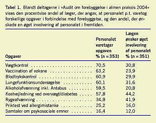 Resultater: Næsten alle (377 ud af 378) havde personale ansat. Mere end halvdelen af lægerne angav, at personalet varetog opgaver i forbindelse med vægtkontrol, vaccination af voksne, blodtrykskontrol, lungefunktionsundersøgelse, alkoholafvænning og kostvejledning. I alt 72% af lægerne ønskede større involvering af personalet inden for et eller flere områder, særligt kostvejledning og rygeafvænning. Personalet var hyppigere inddraget i opgaverne hos de læger, der havde en sygeplejerske blandt personalet, end hos de læger, der ikke havde. Fraset priktest var der ingen sammenhæng mellem personalets deltagelse og lægens køn og alder, praksistype og -størrelse eller graden af regional lægemangel.