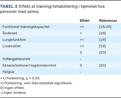 Til trods for aktualiteten, er der kun fundet enkelte studier, hvor man har undersøgt effekten af hjemmetræning ved astma. I disse studier har træning vist sig at være effektiv til at forbedre træningskapacitet hos personer med astma i let til svær grad (Tabel 2). Desuden ses positiv effekt målt ved helbredsrelateret livskvalitet og oplevelse af åndenød [18-20].