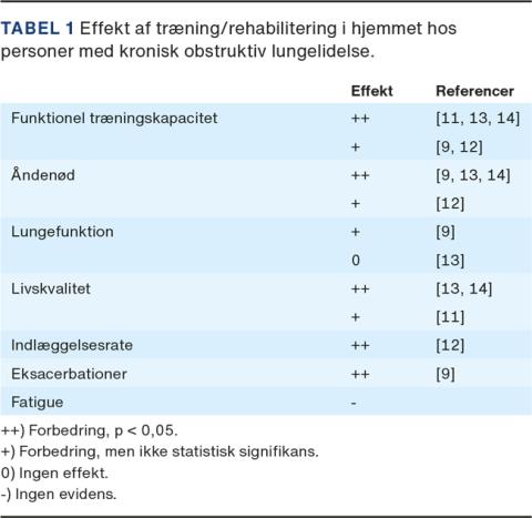 Træning i hjemmet kan give klinisk betydende og statistisk signifikante positive effekter på at reducere åndenød samt forbedre træningskapacitet, livskvalitet og antallet af indlæggelser [9-14] (Tabel 1). Træning i hjemmet kan være et alternativ til struktureret rehabilitering, og studier viser, at træning i hjemmet er ligeværdig med struktureret rehabilitering i forhold til at forbedre livskvalitet, åndenød og træningskapacitet [10, 12, 14]. I enkelte studier har man fundet, at hjemmetræning giver klinisk betydende effekt, men at personer i et struktureret rehabiliteringsforløb opnår større fremskridt [11, 13].