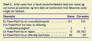 Ved en gennemgang af PowerPoint-præsentationer fra danske sites var det relativt nemt at finde navne og cpr-numre, der var sammenhængende med endog meget følsomme sundhedsoplysninger (Tabel 2 ). Det gjaldt oplysninger om f.eks. helbred, operative indgreb og resultater fra afprøvning af behandlinger.