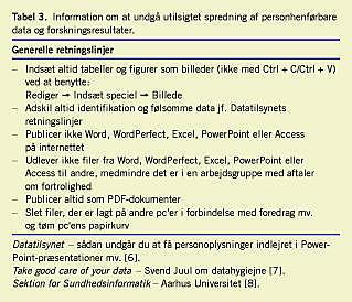Introduktion: Sundhedsvidenskab er baseret på indsamling, opbevaring og analyse af persondata. For at sikre fortrolighed og anonymitet bygger omgangen med disse data på en række love, vejledninger og regler. Når forskere mv. kommunikerer om deres resultater, sker det ofte ved brug af computer og internet. I den forbindelse kan der ske en utilsigtet udbredelse af følsomme persondata. Forskningsdata analyseres og fremstilles ofte grafisk med MS Excel eller MS Word. Efterfølgende indsættes en figur eller tabel i MS PowerPoint eller MS Word for distribution. De kan f.eks. publiceres på internettet som: PowerPoint-præsentation, PowerPoint-show eller som et Word-dokument. Desværre vil man ofte finde hele Excel-dataarket indsat også, og dataene bliver derved tilgængelige. I andre tilfælde benyttes der billeder, såsom røntgenbilleder eller screen dumps i præsentationer, der indeholder persondata.