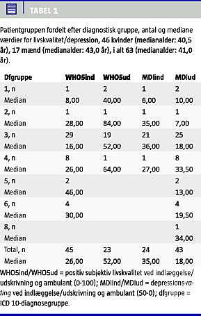 Patientgruppen bestod af 46 kvinder og 17 mænd, der var indlagt på psykiatrisk afdeling eller i behandling i distriktspsykiatrien (24 patienter). Patienterne indgik i undersøgelsen, når det blev fundet relevant at foretage en vurdering af personlighedsfaktorer, og nå r de skønnedes i stand til at svare på de anvendte spørgeskemaer. Eksklusionskriterier var demens, ubehandlet psykose, alder uden for intervallet 18-85 år. Til vurdering af trivsel, livskvalitet og depressionsgrad anvendtes World Health Organizations (WHO's) trivselsindekser (WHO-5) [9] og WHO's Major Depression Inventory (MDI) [10]. Data blev behandlet i SPSS. Der indgik ud over det anførte også oplysning om indlæggelsestid for den aktuelle indlæggelse og om den vigtigste psykofarmakologiske behandling (i artiklen defineret som den optimerede behandling for den enkelte patient) samt alle items fra TCI (226 items). De ambulante patienter svarede kun en gang på WHO-5 og MDI. Ved konfirmatorisk faktoranalyse undersøgtes relationen mellem de enkelte items i TCI og de af forfatterne heraf udpegede kategorier og dimensioner.