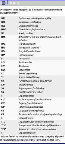 Ved undersøgelse af relationerne mellem de enkelte items og grupperingerne heraf i kategorier og dimensioner af TCI viste det sig, at en række items og kategorier og dimensioner ikke er optimale i patientmaterialet i vores undersøgelse.