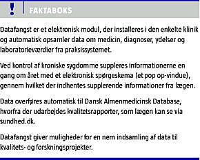 Summary Data collection perspectives from patient care in general practice Ugeskr Læger 2009;171(20):1681-1684 GPs in Denmark have a unique civil registration system with personal ID-numbers, a patient list system and a gatekeeper function. A piece of software (Data Capture) has been developed to automatically collect and send prescriptions, lab tests, expense items and diagnosis information from the physician's patient files to the Danish General Practice Database (DAMD). Furthermore, project-related information can be captured by a pop up screen. Data about the GPs' own quality in the field of patient care are sent back to the GP. Many research projects are currently being initiated on the basis of DAMD data.