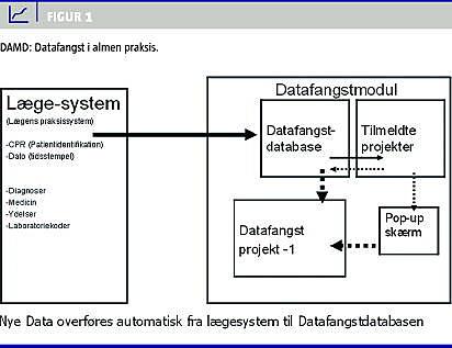 I dansk almen praksis er der 12 forskellige edb-systemer i drift. I et ph.d.- studie [12] viste man, at det var muligt at indsamle patientdata fra fire forskellige lægesystemer, men metoden var kun mulig i et begrænset forskningsprojekt og kunne ikke anvendes i en travl praksishverdag. På basis af disse erfaringer er der udviklet et mere simpelt system, hvor alle strukturerede data udlæses løbende, uden at lægen skal foretage sig noget. Det drejer sig om data vedrørende diagnoser, medicin, sygesikringsydelser og laboratoriesvar. Til kvalitets- og forskningsprojekter er der ofte brug for supplerende ikkestrukturerede data - disse indhentes via et spørgeskema (et pop op-skærmbillede), der udløses i patientkontakten, hvor validiteten i svaret formentlig er størst. De indhentede data sendes en gang daglig til DAMD via sundhedsdatanettet. Fra DAMD-databasen er det muligt at »udrulle« nye projekter til den enkelte læge, som kan vælge, om han vil tilmelde sig mulige kvalitets- og forskningsprojekter i sit datafangstmodul.