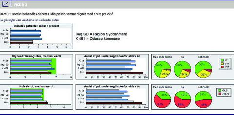 Tilbagemeldinger af egen kvalitet fra DAMD er blevet godt modtaget af lægerne [4]. Det er ud fra rapporterne muligt for lægerne at benchmarke sig mod kolleger på kommunalt, regionalt og nationalt niveau (Figur 2 ), samtidig kan lægen identificere de patienter, der er suboptimalt behandlet og intervenere på deres behandling. Om lægerne så gør det, vides ikke, men undersøgelse af dette pågår. Regionerne planlægger aktiviteter, f.eks. et besøg af en kollega, for at få tilbagemeldingerne omsat til øget kvalitet. Tilsvarende kvalitetsprojekter med kronisk obstruktiv lungelidelse er i pilotdrift. Datafangst til hjerte-kar-sygdomme og hjerteinsufficiens er under udvikling.