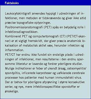 Summary Combined positron emission tomography and computed tomography as a tool for infectious disease diagnostication Ugeskr Læger 2008;170(43):3404-3407 Radiolabelled white blood cells are widely used for scintigraphic evaluation of infection. However, this technique is time consuming and provides rather limited anatomical details. Positron emission tomography (PET) with 18F-fluordeoxyglucose is gaining ground in clinical settings and the added value of combined metabolic and anatomical imaging achieved by combining PET with computed tomography (CT) to PET/CT seems particularly promising. We present the current status for the use of PET/CT in selected infectious diseases based on the limited literature available.