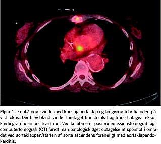 Feber af ukendt årsag (FUO) kan være en klinisk og diagnostisk udfordring (Figur 1 ). Tilstanden blev første gang defineret i 1961 af Robert G. Petersdorf et al som febrilia over 38,3 °C ved mindst to lejligheder i en periode på 2-3 uger og uafklaret diagnose efter en uges indlæggelse. Sidstnævnte er siden revideret til manglende diagnose trods passende udredning. Populært angives det, at de mulige årsager kan være infektion, okkult malign lidelse og autoimmun inflammatorisk systemsygdom med omtrent samme hyppighed, men i op mod en tredjedel af tilfældene stilles en endelig diagnose ikke trods omfattende udredning. FDG PET giver mulighed for helkropsskanning med et sporstof, der potentielt akkumuleres i alle tre tilfælde, hvorfor sensitiviteten teoretisk set er høj, mens specificiteten er tilsvarende begrænset [1]. Dette kan dog opfattes positivt, idet udredningens primære formål er at påvise og lokalisere uanset ætiologi. Der er kun publiceret seks studier med FDG PET (n = 16-74), som er samlet i en nyere oversigtsartikel [1]. Selvom studiedesign, patientpopulationer og resultatopgørelse er varierende, synes resultaterne lovende: PET bidrog positivt til diagnosen i 25-87% af tilfældene, og teknikken spås et betydeligt potentiale, specielt i kombination med CT. En særlig fordel ved kombineret FDG PET/CT er, at man opnår informationerne med en enkelt undersøgelse i modsætning til den gængse diagnostiske strategi, der ofte involverer en række forskellige modaliteter, der er fordelt på flere undersøgelsesdage.