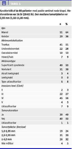 I alt 80 patienter (29 kvinder og 51 mænd) blev inkluderet i undersøgelsen. Medianalderen var 56 (28-82) år. Den mediane tumortykkelse var 2,93 (1,02-11,00) mm. 51% af melanomerne var lokaliseret til trunkus, 28% på underekstremiteterne, 13% på overekstremiteterne og 9% i hoved-hals-gebetet. Level var fordelt på level II (3%), level III (27%), level IV (56%), level V (5%) og uklassificerbar (9%) (se Tabel 1 ).