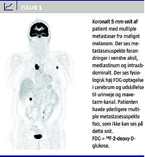 Man har i flere studier har bekræftet, at FDG-PET er af begrænset værdi til stadieinddeling af uselekterede stadie I- og stadie II-MM-patienter, og FDG-PET kan ikke erstatte SNB's rolle i den initiale stadieinddeling [10]. Derimod er det veldokumenteret, at FDG-PET er effektiv til at detektere viscerale melanommetastaser med en specificitet på 56-100% og en sensitivitet på 67-100% [9]. Desuden er FDG-PET fundet at være bedre end konventionelle undersøgelser som klinisk undersøgelse, røntgen, ultralydsskanning og CT med hensyn til diagnosticering af fjernmetastaser [9, 11].