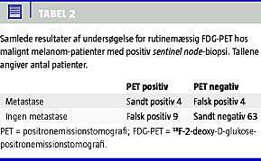 Resultater: I alt 13 af de 80 patienter havde metastasesuspekt FDG-PET, hvoraf fire patienter (5%) fandtes sandt positive ved verificerende undersøgelser. Af de 67 patienter med negativt FDG-PET-fund udviklede fire patienter (5%) klinisk recidiv inden for seks måneder efter sentinel node-biopsi (falsk negativ). Sensitiviteten var derfor 50% og specificiteten var 31%.