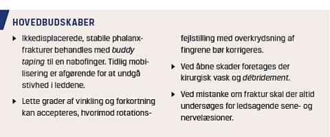 Phalanxfrakturer og -luksationer forekommer hyppigt. Incidensen er 68/100.000 årligt [1]. Primærbehandlingen sker ofte i almen praksis eller på en skadestue. Størstedelen af frakturerne er minimalt displacerede og ekstraartikulære og kan behandles ikkeoperativt. Ved intraartikulære frakturer, frakturluksationer eller ledsagende sene- eller ligamentskader kan det være en udfordring at afgøre, om der er operationsindikation, og hvornår håndkirurgisk vurdering er relevant. En overset eller fejlbehandlet phalanxfraktur kan resultere i nedsat funktion, stivhed, kroniske smerter og deformitet [2]. I denne artikel gives en kort oversigt over de mest almindelige phalanxfrakturer og -luksationer og behandlingen af dem samt retningslinjer for, hvornår patienterne bør henvises til kirurgisk vurdering.