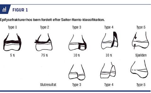 Traumemekanismen er ofte klem- eller lacerationsskader i hjemmet hos mindre børn og sportsaktiviteter hos større børn [8]. Frakturer i epifysen opdeles efter Salter-Harris-klassifikation (Figur 1) [9]. Diafysefrakturer er mindre hyppige hos børn end hos voksne og kan behandles med buddy taping. Displacerede frakturer kræver ofte åben reposition og fiksering med K-tråd eller skrue [10]. Subkapitale frakturer ses næsten udelukkende hos børn. Kondylerne på phalanx er ikke fuldstændigt ossificerede, men består overvejende af brusk, som kan adskilles fra diafysen og displaceres volart eller dorsalt om diafysen [11]. Displacerede frakturer kræver reposition og pinning, eventuelt foretaget åbent [11]. Blodforsyningen sker via kollaterale ligamenter [10], og der er risiko for avaskulær nekrose af det distale fragment, fingeriskæmi og pseudoartrose ved multiple pinning-forsøg [12].
