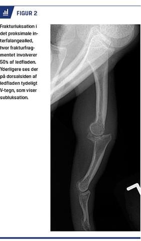V-formet hul i den dorsale ledlinje (V-tegn) [23]. Der forekommer ofte læsion eller avulsionsfraktur af volarpladen med tab af volar støtte [2]. Mindre skader behandles med buddy taping og tidlig intensiv træning for at forhindre senfølger. Ved større avulsionsfragmenter kan de kollaterale ligamenter miste kontakten til mellemphalanx, som derfor sublukserer dorsalt (Figur 2) [24]. Volare frakturluksationer kan være ledsaget af