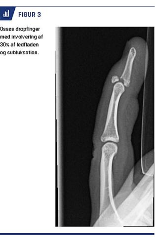 Formålet med behandlingen af dropfinger er at genoprette den aktive ekstension i DIP-leddet. Der er ikke konsensus om behandlingsmodalitet og -længde [26]. De fleste forfattere anbefaler dog operativ behandling ved åbne læsioner, involvering af mere end en tredjedel af ledfladen (Figur 3), subluksation, ledinkongruens og svigt af ikkeoperativ behandling [27]. Ved skinnebehandling holdes DIP-leddet kontinuerligt ekstenderet i en neutral stilling i seks uger, mens PIP-leddet er frit bevægeligt [27]. Behandlingen gentages, hvis DIP-leddet flekteres inden for seks uger, og der opstår reruptur eller refraktur [27]. Nogle forfattere anbefaler intermitterende immobilisering med efterfølgende brug af natskinne. 40% af de skinnebehandlede har imidlertid en persisterende strækkedefekt på 5-10 grader i DIP-leddet, mens 70% af patienterne har hudproblemer