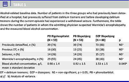 Der blev foretaget en retrospektiv gennemgang af journaler fra henholdsvis Rigshospitalets og Bispebjerg Hospitals psykiatriske afdelinger fra perioden 1998-2006. Patienter med International Classification of Diseases 10-diagnosen F10.4 (DT) blev inkluderet, hvis de havde svære fysiske abstinenssymptomer, synshallucinationer og bevidsthedsplumring. På Bispebjerg Hospital blev patienterne i perioden 1998-2001 behandlet med phenobarbital (n = 53), mens de i perioden 2002-2006 fik diazepam (n = 88). På Rigshospitalet blev alle de inkluderede patienter behandlet med phenobarbital (n = 53).