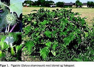 Pigæble (Datura stramonium ) er en 15-100 cm høj grøn plante med grenet stængel og store, ægformede, groft bugtettandede blade. Den blomstrer i juli-september med store tragtformede, hvide blomster. Frugten er en valnøddestor pigget frøkapsel, der indeholder 50-500 blåsorte frø (Figur 1 ). Planten er udbredt fra Sydøsteuropa til Østasien og er indført uden for dette område som bl.a. lægeurt. Som andre medlemmer af natskyggefamilien indeholder pigæble belladonnaalkoider, hovedsagelig hyoscyamin, skopolamin og atropin, der forekommer i hele planten, dog med den højeste koncentration i frøene (0,2-0,5%) [1].