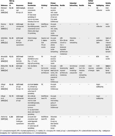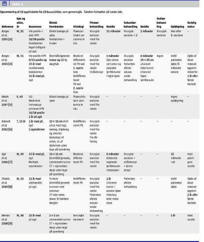 I de 15 nye sygehistorier rapporteres om 13 mænd og to kvinder. En patient havde ikke tidligere haft pilonidalsygdom [4]. To patienter havde haft pilonidalsygdom i to år forud for konstatering af neoplasi [5, 6]. Tolv patienter havde haft pilonidalsygdom i otte år eller mere [4, 7-16] (Tabel 1).