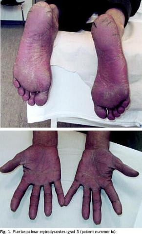 Med udviklingen af nye kemoterapeutika og antineoplastiske behandlingsregimener fremkommer der også nye bivirkningsprofiler, som kan have betydning for såvel tolerabilitet som intensitet af den fortsatte antineoplastiske behandling. Her beskrives to karakteristiske sygehistorier, hvor plantar-palmar erytrodysæstesi (PPE) optræder som en dosisrelateret og -limiterende bivirkning ved behandling med capecitabin, der er en antimetabolit indregistreret til peroral anvendelse ved metastatisk kolorektal cancer.