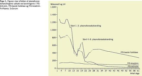 Da patienten efterhånden var desperat, blev det besluttet at forsøge plasmaferese. På en klinisk immunologisk afdeling blev der udskiftet ca. 3,5 l plasma pr. gang. Der blev i første omgang givet tre terapeutiske plasmaferesebehandlinger, som resulterede i et fald i P/S-bilirubin fra 769 til 463, P/S-basisk fosfatase fra 1.060 til 385 U/l (ref. 80-275 U/l) og et P/S-kreatininfald fra 160 til 138 μ mol/l (ref. 62-132 μ mol/l). Den meget høje P/S-bilirubinværdi blev tilskrevet nedsat filtration som følge af den nedsatte nyrefunktion jf. Figur 1. Kløen aftog.