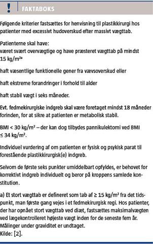 I Danmark er der udarbejdet en fællesprotokol for plastikkirurgi hos patienter med excessivt hudoverskud efter massivt vægttab, hvor krav til behandlere og indikation i offentligt regi beskrives [2]. Heraf fremgår det, at der skal være gået 18 måneder fra et fedmekirurgisk indgreb, til et plastikkirurgisk indgreb kan udføres. Patienterne skal desuden have været vægtstabil i seks måneder, og alle skal vurderes af en medicinsk specialist, før de får foretaget plastikkirurgi. Patienter, som har tabt mere end 15 kg/m2, skal have væsentlige funktionelle gener fra hudoverskud eller ekstreme forandringer i forhold til deres alder. Der skelnes ikke imellem forskellige vægttabsmetoder [2]. Eftersom bariatrisk kirurgi kan medføre et tab på 50-80% af overvægten, vil patienterne sjældent opnå et BMI på ≤ 25 kg/m2 [3, 4].