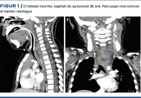 Pga. klinisk forværring blev hun tre måneder senere henvist til bronkoskopi. Her fandt man trachea komprimeret, og man foretog derfor i samme seance fleksibel og rigid øsofagoskopi, der afslørede en 2 cm stor, blå plastmønt, der var indgroet i den proksimale øsofagus. En akut CT viste normale anatomiske forhold fraset mønten (Figur 1), der herefter blev fjernet ved rigid øsofagoskopi uden perforation af øsofagus.