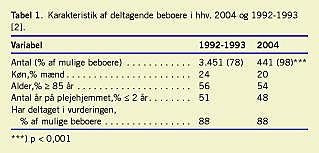 Resultaterne af den sammenlignende undersøgelse(Tabel 3) tyder på, at den kognitive og fysiske funktionsevne var dårligere i 2004 end i 1992-1993. Der var en tendens til, at medicinforbruget steg, mens andelen af beboere, der fik rehabilitering synes at være faldet.