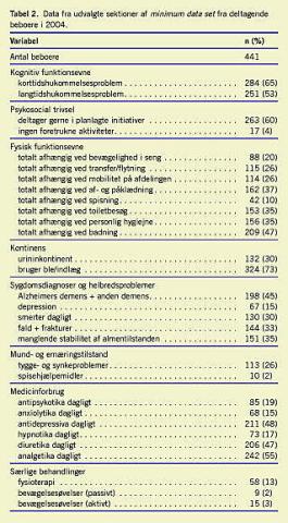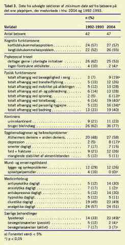 Materialer og metoder: I alt 441 beboere på 11 plejehjem i Dan-mark blev vurderet vha. minimum data set , et standardiseret værktøj, mht. bl.a. kognitiv funktionsevne, psykosocial trivsel, fysisk funktionsevne og problemer, kontinens, sygdomsdiagnoser, mund- og ernæringstilstand, medicinforbrug og behov for særlige behandlinger (fysioterapi, rehabilitering m.v.). Resultaterne fra et plejehjem blev sammenlignet med resultaterne fra en tilsvarende undersøgelse, der blev gennemført i 1992-1993 på samme plejehjem.