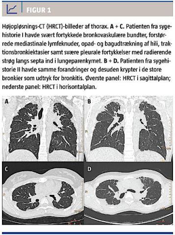 HRCT-thorax viste i begge lunger apikal fortykkelse af de interlobære septae, traktionsbronkiektasier, perifere konsolideringer og pleural fortykkelse samt enkelte forstørrede lymfeknuder i mediastinum (Figur 1). I 2007 var lungefunktionen nedsat, og